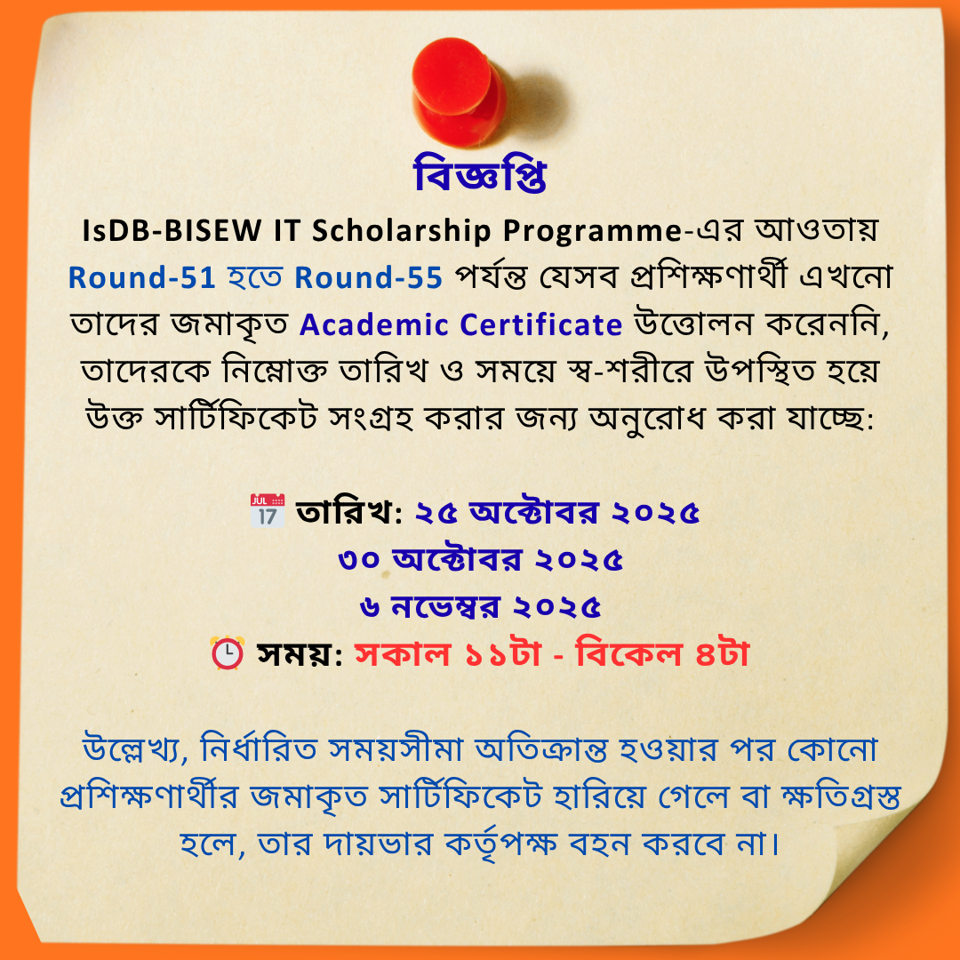 Academic Certificate উত্তোলন সম্পকৃত বিশেষ বিজ্ঞপ্তি (Round-51 to Round-55) Oct 15, 2025 / IT Scholarship Programme