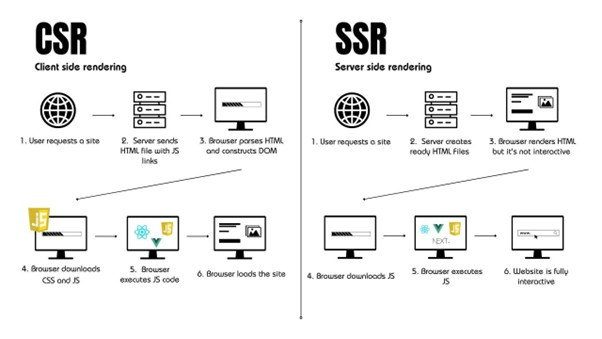 Imagine that you are going to a restaurant. With CSR, the chef would give you the ingredients and the recipe, and you would cook the meal yourself at your table. With server-side rendering (SSR), the chef would prepare the entire meal in the kitchen and then bring it to your table.